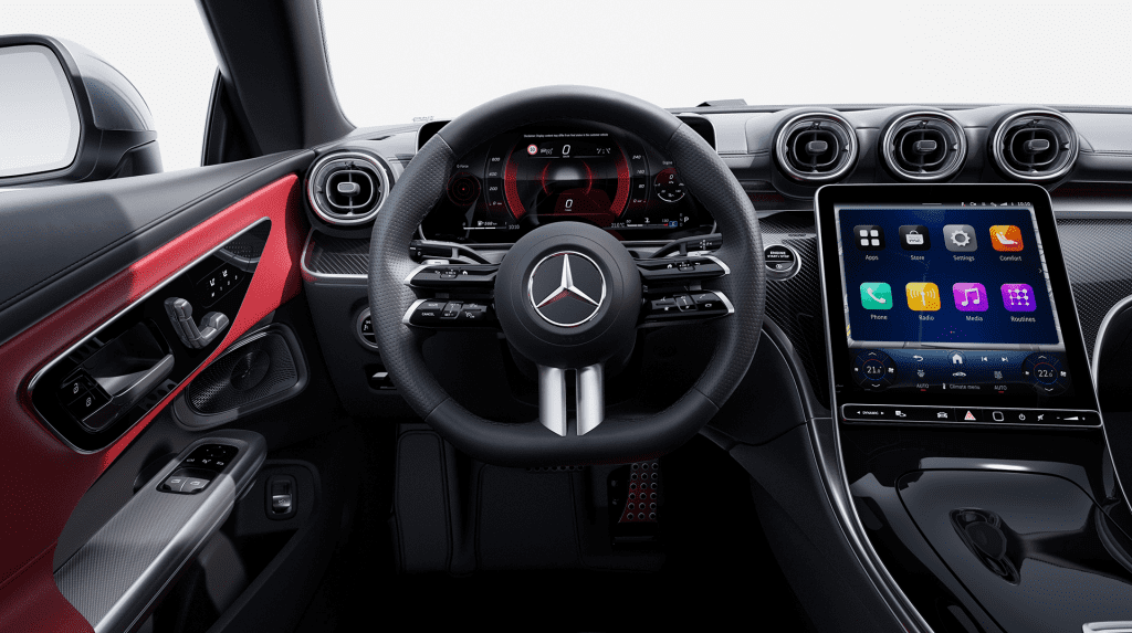 MBUX Infotainment System, Voice Control ("Hey Mercedes"), Apple CarPlay and Android Auto, Wireless Charging, Burmester Surround Sound System, Dual-Zone Automatic Climate Control, 64-Color Ambient Lighting, Keyless-Go, Panoramic Sunroof, AMG Styling Package, Electrically Adjustable Seats, AMG Performance Steering Wheel